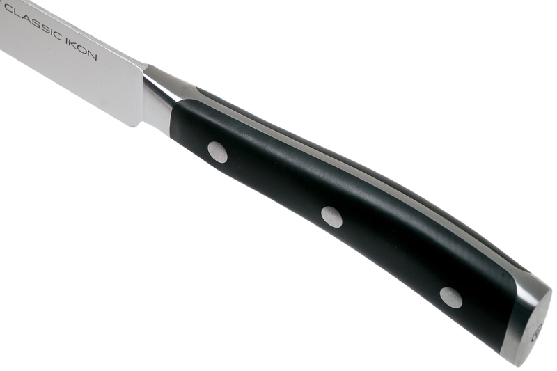 Rukoväť je urobená z veľmi pevného materiálu POM. Je odolný voči teplu, otrasom aj kyselinám, ľahko sa udržiava čistý. Materiál ideálny do kuchynského prostredia. Ergonomicky tvarovaná, k čepeli dosadá bez medzier a s čepeľou je pevne tromi nitmi.