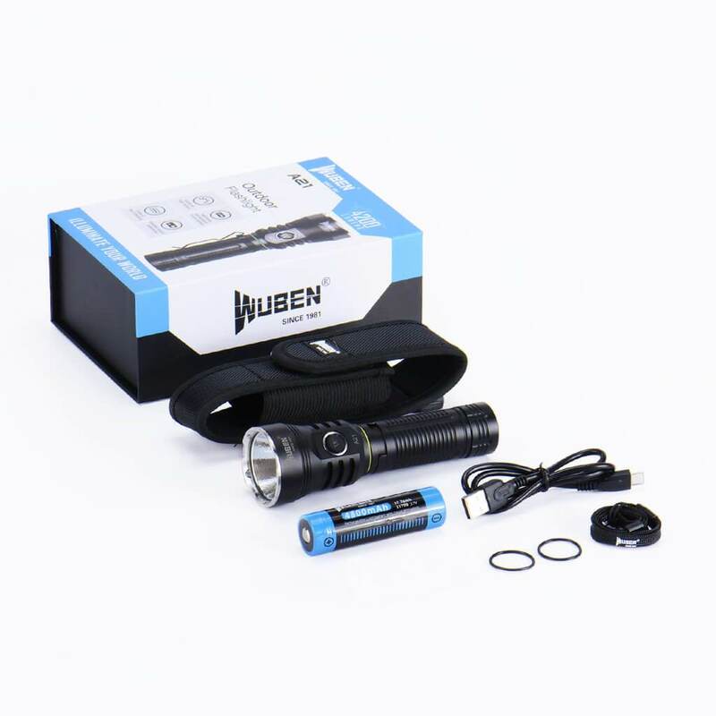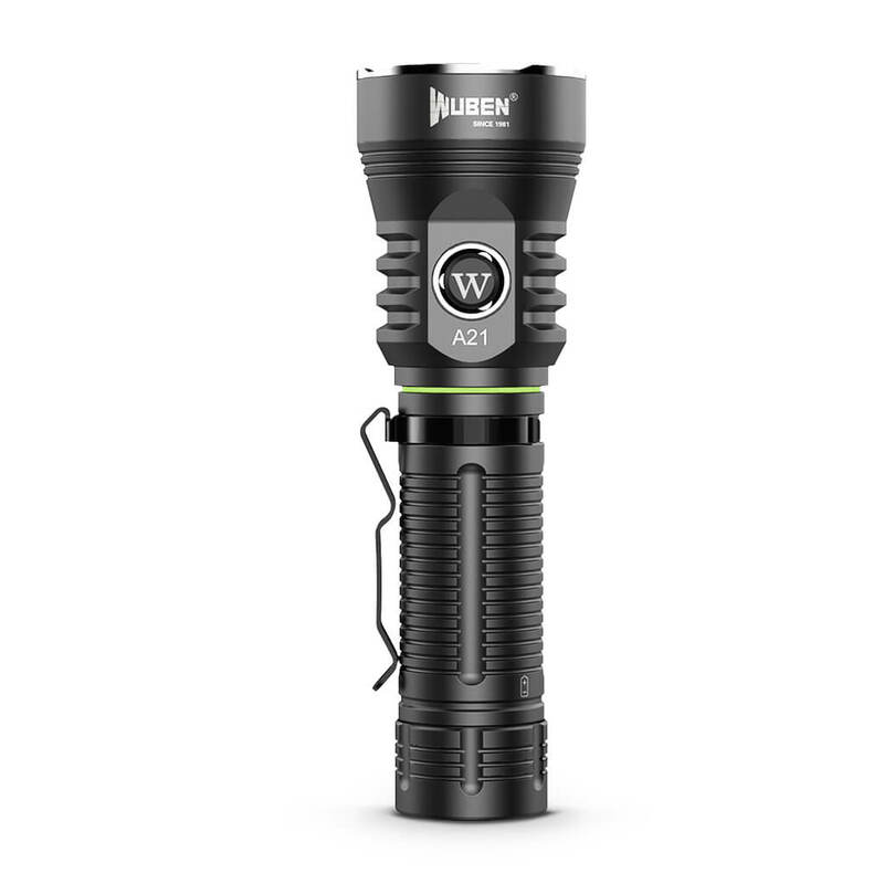 Extrémne výkonná nabíjateľná baterka Wuben A21 je vhodná pri kempovaní, stanovaní, outdoorových aktivitách, ale aj na bežné činnosti doma. Je vyrobená z eloxovaného hliníka a je odolná voči vode (IP68).