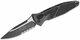 Má čepeľ s hladkou hranou typu Clip Point z nerezovej ocele AUS-10A s čiernym PVD povrchom, otvára sa obojstranným palcovým kolíkom a zaisťuje ju patentovaný posuvný zámok Atlas Lock.