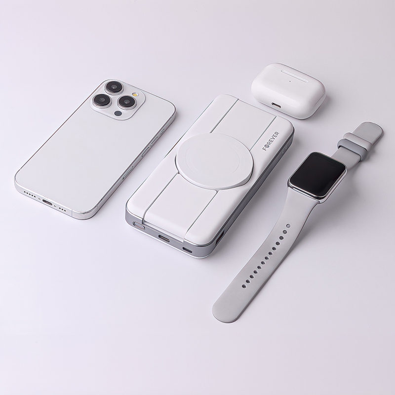 Bezdrôtová powerbanka Forever MATB-300 s kapacitou 10000mAh umožňuje súčasné nabíjanie troch zariadení: telefónu, AirPods a Apple Watch.