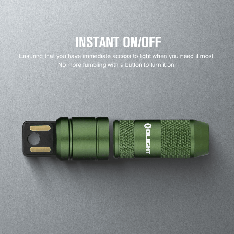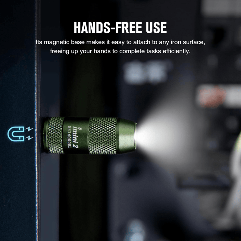Mini nabíjateľná baterka Olight imini 2 OD Green na každodenné nosenie, má magnetickú základňu na pripevnenie k akémukoľvek železnému povrchu, čo umožňuje mať obe ruky voľné na iné činnosti.