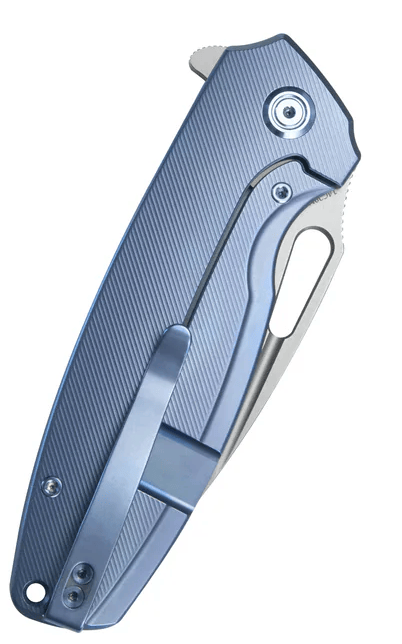 Rukoväť je z ľahkého a odolného titánu 6AL4V modrej farby, s otvorom na šnúrku a titánovou sponou na vrecká.