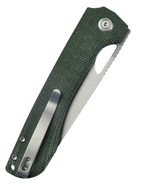 Rukoväť je z materiálu Micarta tmavozelenej farby, s otvorom na šnúrku a sponou na vrecká.