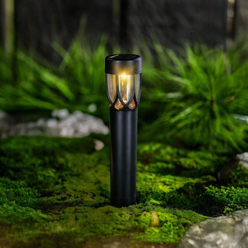 Solárne LED lampy Modee Solar Stake light lamp GS039 (40cm) (10pcs/display) sú vďaka svojmu modernému dizajnu a energeticky úspornej prevádzke perfektnou voľbou pre každú záhradu alebo dvor. Čierne valcové telo a zdobené tienidlo vytvárajú elegantný vzhľad, zatiaľ čo teplé biele svetlo poskytuje atmosférické osvetlenie .