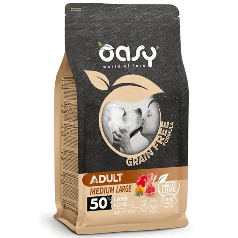 Bezobilninové granule Oasy Grain free Adult Medium/Large Lamb 2,5 kg sú kompletné krmivo pre dospelé psy stredných a veľkých plemien od 1 roka, vyrobené bez obilnín a bez lepku. Receptúra rešpektuje prirodzenú „mäsožravú“ povahu psa – obsahuje vysoký podiel mäsa pre maximálnu chutnosť a 50 % jahňaciny ako jediný živočíšny zdroj bielkovín. Je vhodná aj pre psov s citlivosťou (trávenie, koža, intolerancie) a vďaka glukozamínu a chondroitínu podporuje aj pohybový aparát.