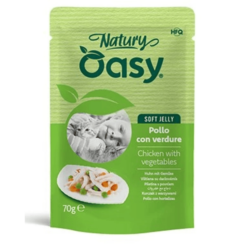 Kapsička Oasy natury Soft Jelly Chicken with Vegetables (pouch) 70 g je lahodné mokré krmivo pre dospelé mačky, ktoré spája kvalitné kuracie mäso s čerstvou zeleninou. Jemná želé podčiarkuje chuť a prináša vyváženú výživu, ktorá podporuje zdravie a vitalitu mačky každý deň.