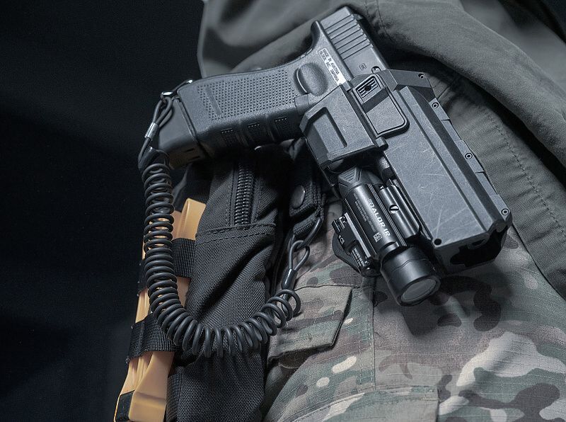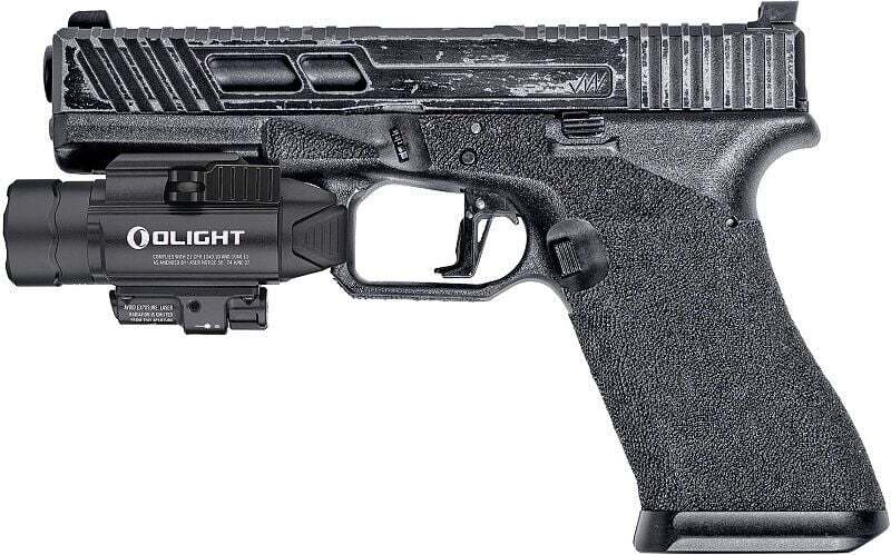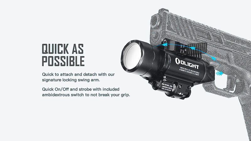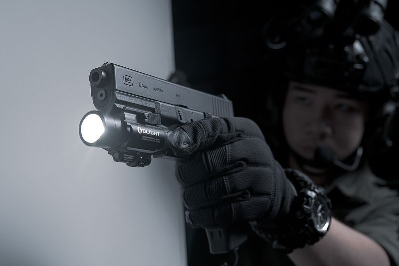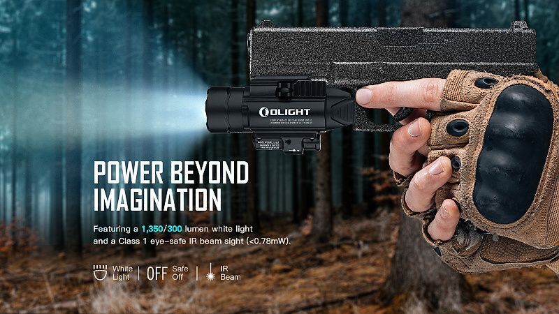 Profesionálne taktické LED svietidlo na zbraň so zeleným IR laserovým zameriavačom. Svietidlo na zbraň Olight je napájané dvomi batériami CR123A, ktoré vďaka efektívnej neutrálnej bielej LED a optike PMMA poskytujú svetelný lúč 1350 lumenov a dosah až 260 m.