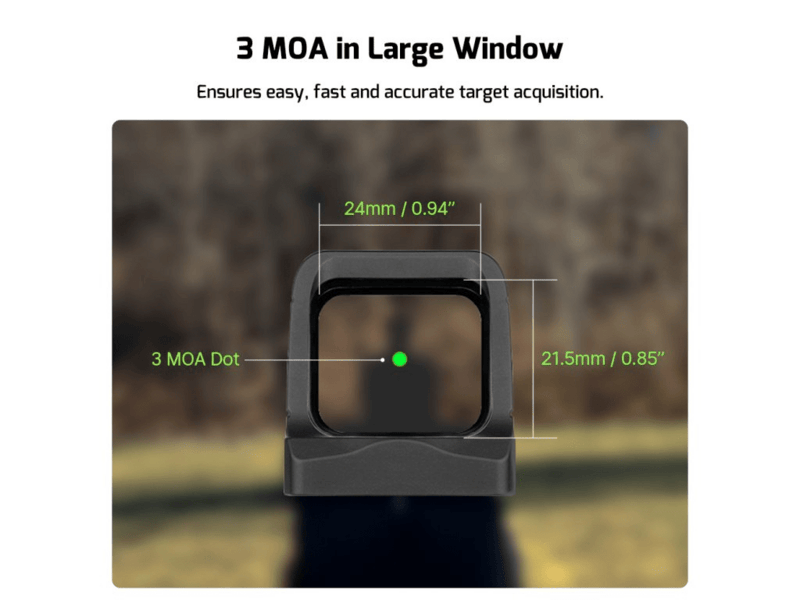 Kolimátor disponuje širokým pozorovacím oknom s rozmerom 24x21,5 mm. Bod 3 MOA zreteľne vyniká pre rýchle a presné zameranie. Bod je jasný a ľahko lokalizovateľný, čo zaručuje rýchle a presné zameranie. Optika Osight vydrží a udrží nulu pri viac ako 10 000 vystrelených nábojoch. Zaručuje spoľahlivosť a udržanie nástrelu za všetkých okolností.
