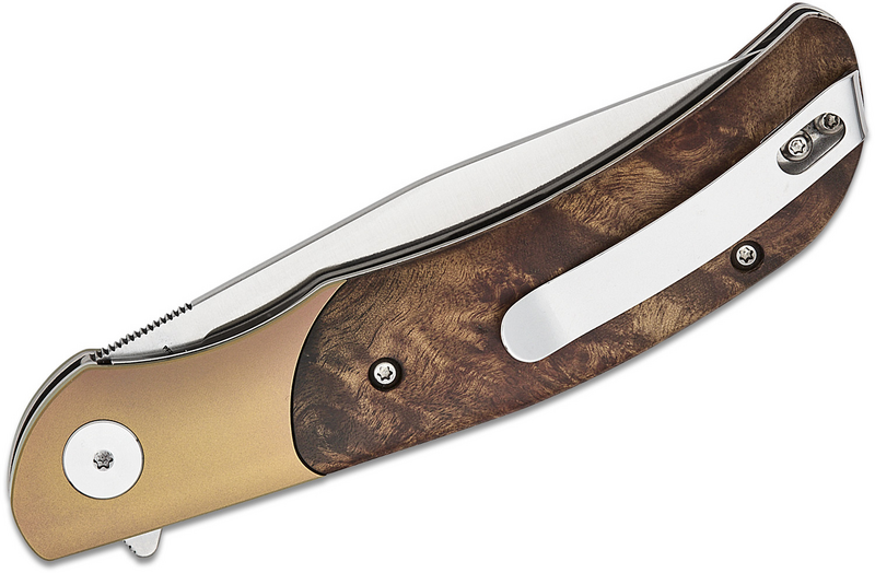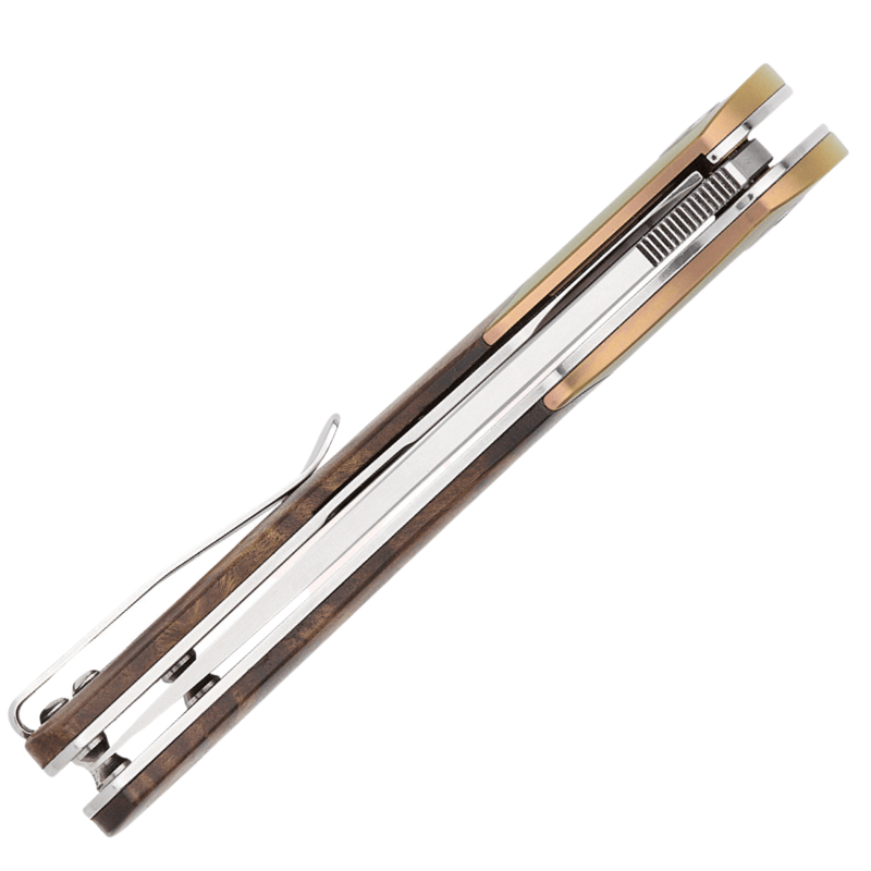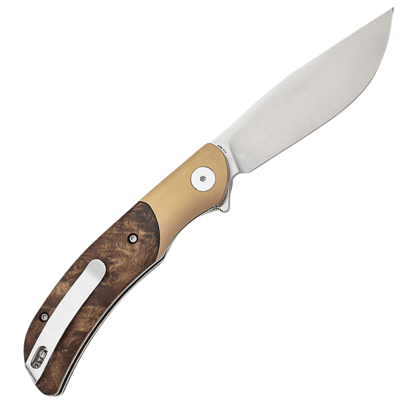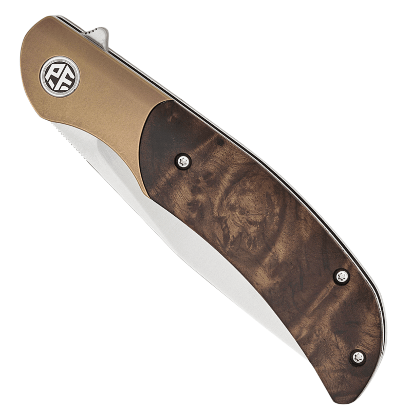 Dizajn PFP09 Hourglass vyvoláva predstavy predátora so svojimi hladkými krivkami a ostrými bodmi. Veľká drop point čepeľ je vyrobená z odolnej K110 nástrojovej ocele s povrchovou úpravou satin, ktorá skvele odoláva opotrebeniu. Jimping na chrbte čepele umožňuje pevný úchop, zatiaľ čo jimping na flipper tabu zabezpečuje rýchle a jednoduché otváranie. Tento model sa pýši nádhernými črienkami z Gall dreva s bronzovo eloxovanými titánovými bolstrami, ktoré zaručujú gentlemanský vzhľad, pričom si zachovávajú charakteristiky drsného vonkajšieho prostredia. Rýchly a spoľahlivý bez toho, aby zruinoval váš rozpočet, určite si zamilujete Hourglass od Petrified Fish.
