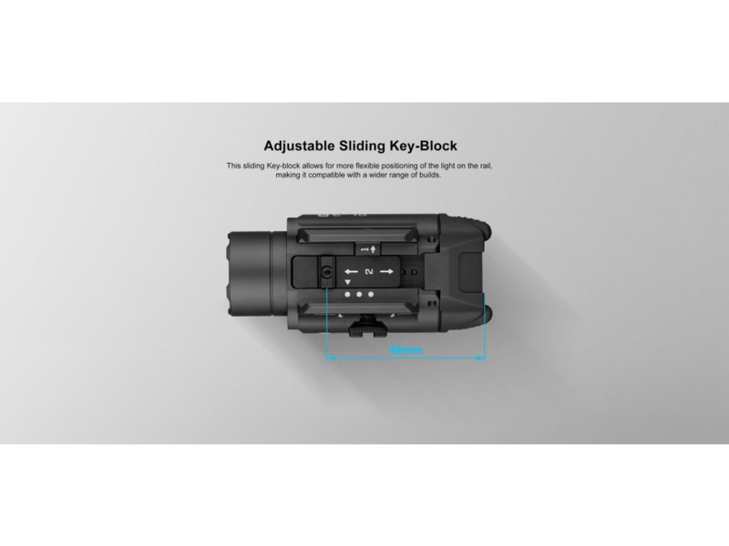 Svietidlo je navrhnuté pre pištole s picatinny koľajnicou alebo Glock štýlovou koľajnicou a prichádza s dvoma adaptérmi na montáž (1913 a GL), čo ho robí kompatibilným so širokou škálou pištolí. K dispozícii je tiež nastaviteľný posuvný blok s tromi polohami, ktorý umožňuje flexibilné nastavenie na rôznych koľajniciach.